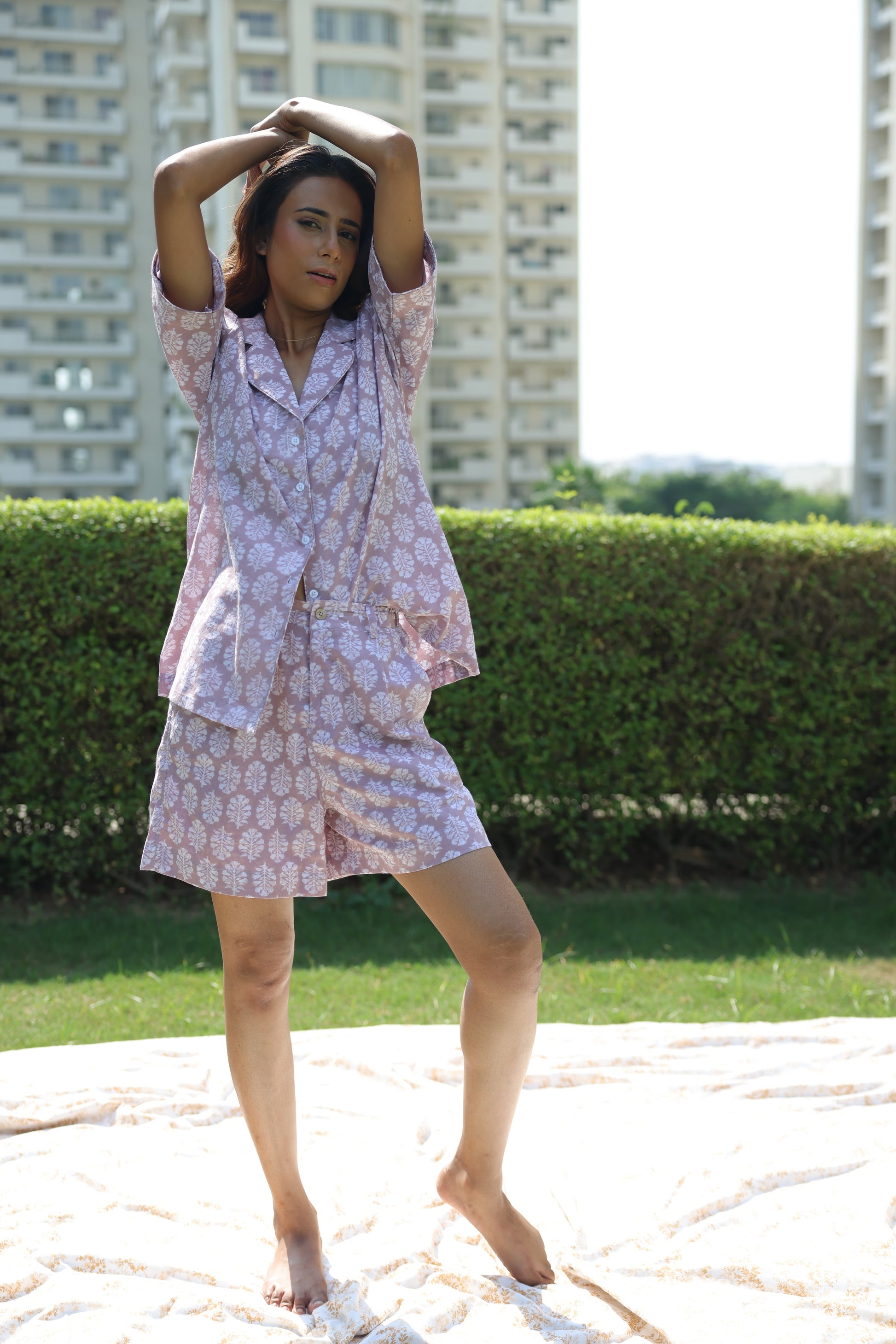 Add a touch of elegance to your downtime with this handcrafted block print co-ord-set. Disigned in a soft blush pink hue with inrticate floral motifs, This set features a relaxed-fit shirt with anotched coller and matching shorts for altimate comfort. Perfact for lounging, travel or casual outings, this breathale cotton ensamble showcases a fusion of tradition craftmanship and morden style, making it an ideal addition to your wordrobe